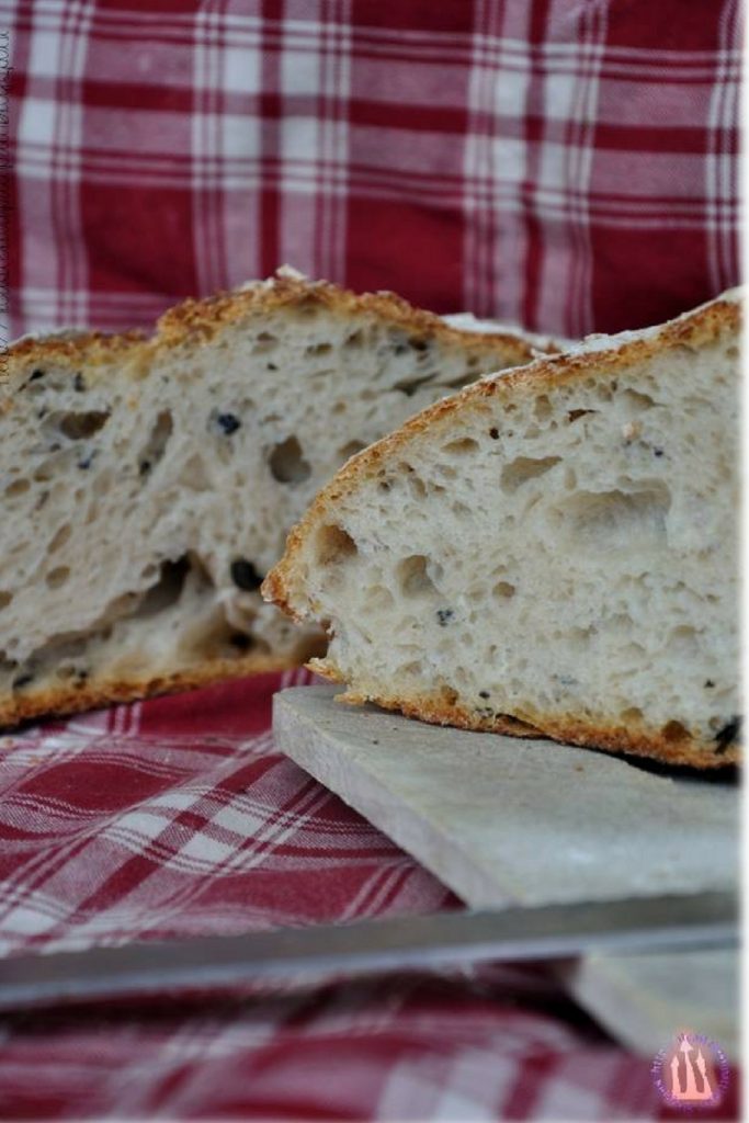 Questa pagnotta che propongo per la GN delle olive del Calendario del Cibo, la cuoca l’aveva fatta tre anni fa, l’aveva vista da Patrizia di Pan di Pane. La cuoca aveva ricevuto da poco l’impastatrice ed era entusiasta di cosa potevano combinare insieme lei e la sua asta madre, Maddalena. Confesso che questa pagnotta la cuoca la sforna spesso in mille declinazioni: normale, con farina di farro, al finocchietto, ai pomodori secchi… e ogni volta che la tira fuori dal forno si commuove, perchè non le sembra vero che così bella l’abbia fatta lei: la crosticina è croccante, l’interno è morbido, insomma in famiglia ne vanno matti.
