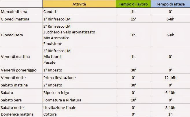 To get a good leavened you must have patience, love, attention to what you do. So my advice is to read at least twice the instructions, ingredients and processing times, so to be sure you have all ingredients, all the time you need to make a good job and the strenght to arrive at the end. First of all prepare all the mixes you will need the day before. It will require at least one hour, but if you start your job with one hour cooking on your shoulder it could be hard. In this site I’ve found this time table and I’ve translated it for you. It’s simple and if you work following this plan you won’t have any problem. Ready?
